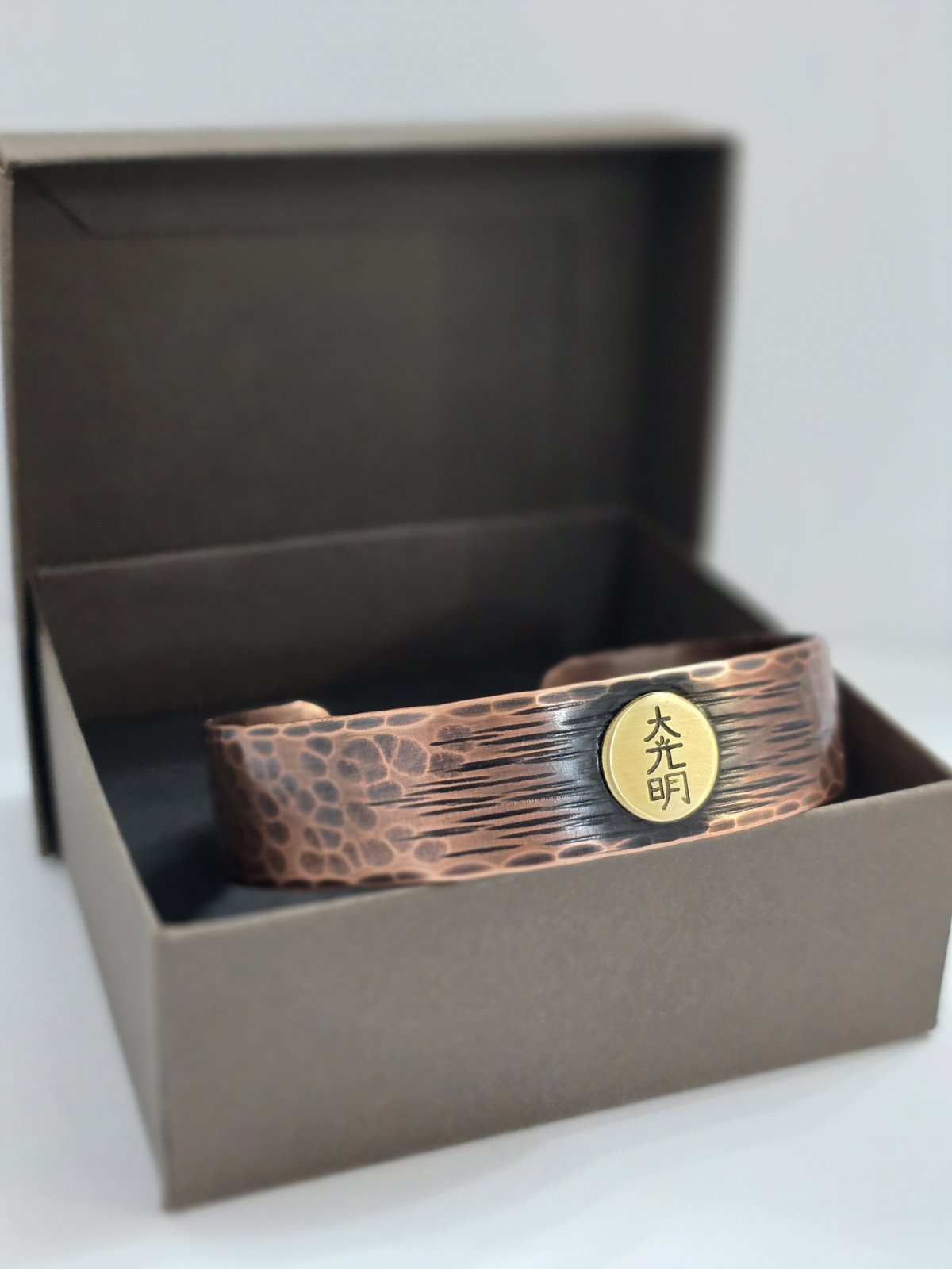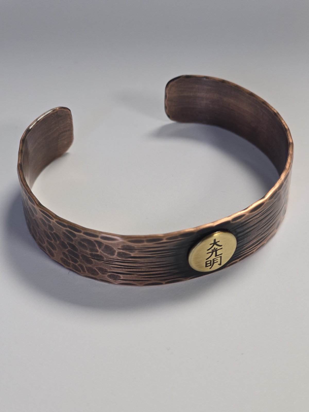 Ta ročno izdelana bakrena zapestnica nosi simbol Dai Ko Myo, najmočnejši reiki simbol, ki predstavlja duhovno moč, zdravljenje in povezavo z višjo zavestjo. Simbol deluje kot ključ za osebno transformacijo, poglablja intuicijo in podpira energetsko harmonijo telesa, uma in duha.